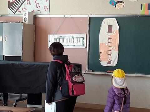 今日は、「保護者同伴小学校見学会」がありました。来年度角鹿小学校に入学する新1年生がお家の人と一緒に、1年生の授業参観と校舎内の見学をしました。