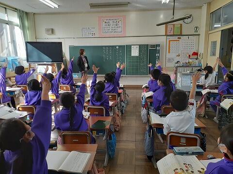 1年生の国語「これはなんでしょう」の様子です。スリーヒントクイズを出し合って、楽しんでいる様子を見学してもらいました。