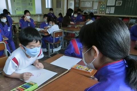 今日は、1年生と6年生が似顔絵で交流しました。6年生が被写体になり、1年生が似顔絵を描きます。