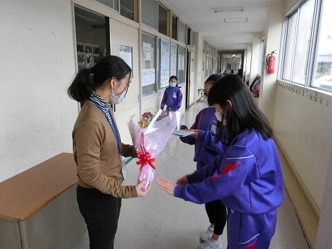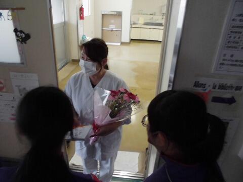 昼休みには、用務員さん、配膳員さんにも花束と手紙を送りました。「いつも学校のためにいろいろな仕事をしてくださってありがとうございます。」