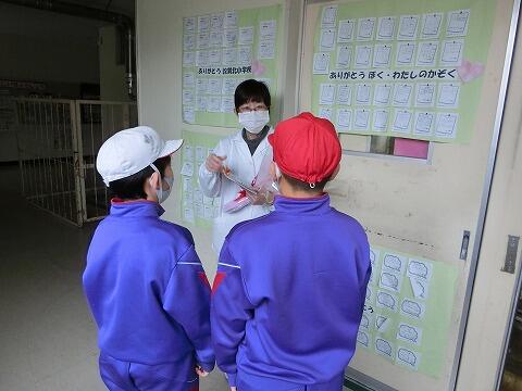 4時間目の授業終了後に給食委員会の児童が、日頃の感謝の気持ちを込めて花束と手紙を渡しました。「いつもおいしい給食を作ってくださってありがとうございます。」