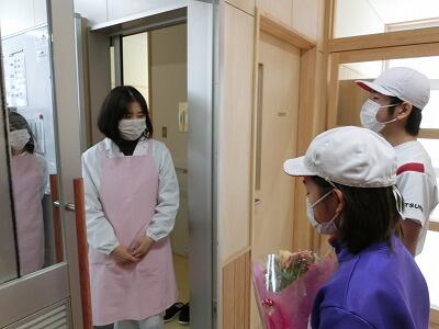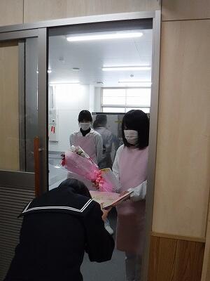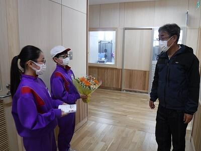 小中学校の児童生徒が、日頃お世話になっている配膳員さんや栄養士さん、用務員さんに、感謝の手紙を書きました。給食委員と美化委員が児童生徒を代表して、その手紙と花束をプレゼントしました。