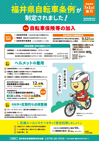 保険の加入が必要になります。小中学生にはPTA保険(年額400円)を新年度お知らせすることになる予定です。高校生や大人の皆さまはそれぞれで加入が必要となるようです。ヘルメットの着用も「努力義務」となります。現在小学生は「義務」中学生は「努力義務※自転車通学は義務です」となっていますが、中学生も義務化を検討中です。