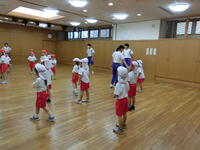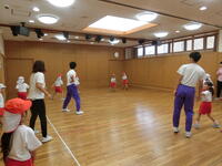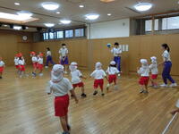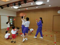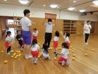 園では、たくさんの園児に囲まれながら、一緒に体を動かしたり、ゲームをしたりする