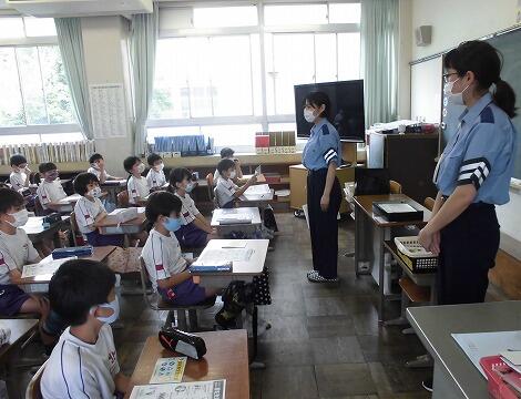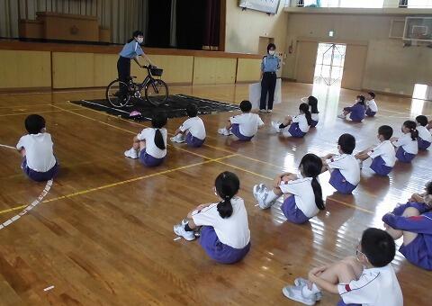 敦賀市生活安全課から2名の指導員さんが来校され、交通ルール、自転車の点検、安全確認、乗る時の注意などを教えていただきました。