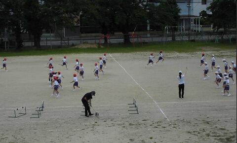 3年生の体育では、リズミカルにハードルを走り越える練習をしました。