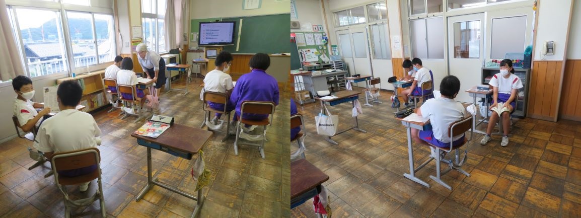 「5 We all live on the Earth.」 ペアになって、生き物たちの暮らす場所や食べ物などについて、英語で尋ねたり応えたりする練習をしています。 |