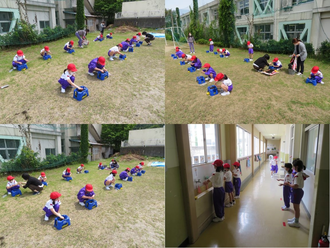 今日は、あさがおの種まきをしています。プランターに土を入れて、穴をあけて、ひとつぶずつ植えていきます。作業の後は、3密をさけて、しっかりと手洗いをしました。