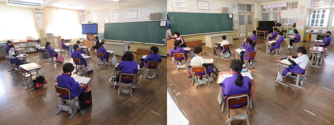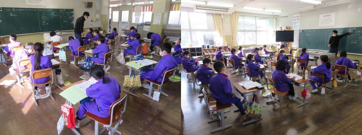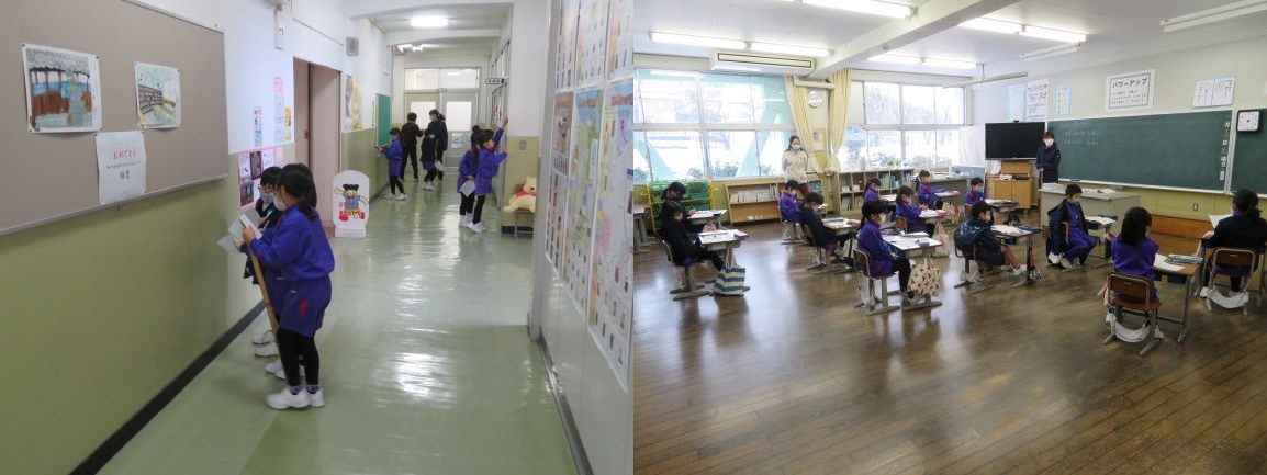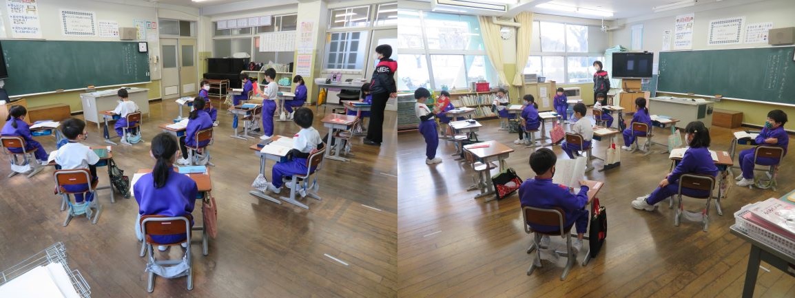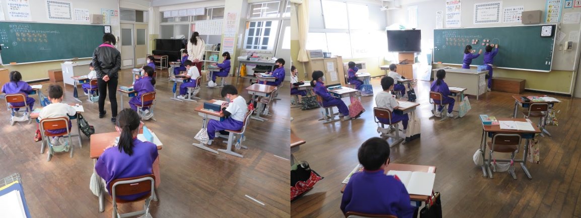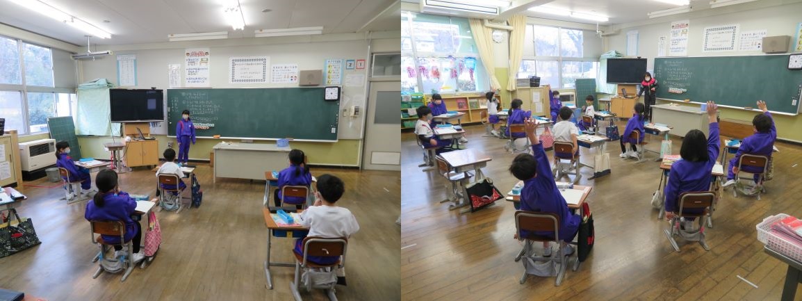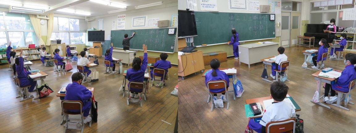 今日は、特設業間の時間に、1年生が発表をしました。演題は「おむすびころりん」です。 おやっ、6年生が修学旅行で、芝政に行ってパークゴルフをしています。その後、お腹がへった6年生がお昼ごはんを食べていると、食べている「おむすび」がころがっていきました。あわてて追いかけると、大きな穴の中に。その穴の中からは、「おむすびころりん・・・」と歌が聞こえてきます。 6年生は、歌に合わせて踊り出しました。 ここでメッセージ「昼の放送をしてくれたり、登校班の班長でリードしてくれたり、ラジオ体操を教えてくれたり、いつもやさしい6年生、大好き。」 次に、ねずみにふんした1年生12名が、「ねずみの踊り」を発表しました。そして、4種類の楽器を使った「ねずみの合奏」。 そして最後に、1年生から、「6年生のみなさん、もうすぐ卒業ですね。器械運動発表会でのかっこいい技、動きのそろったラジオ体操がとってもすごかったです。中学校へ行っても、勉強や運動にがんばってください。応援しています。」と、メッセージを送りました。 |
