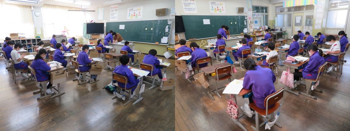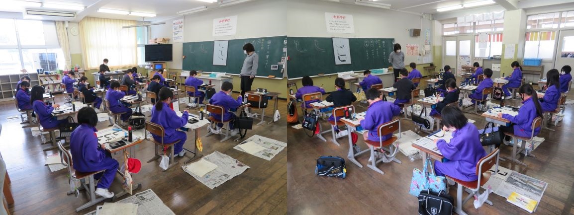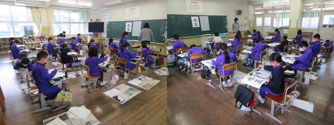 「三年生のまとめ」 三年生のまとめとして「水玉」という字を書いています。これまで学習してきたことに気をつけて、一生懸命練習しています。 |