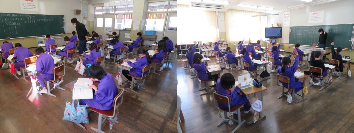 「18 小数」 小数と分数の大きさを、どのように比べたらいいかを、みんなで考えた後、練習問題にチャレンジしています。 |