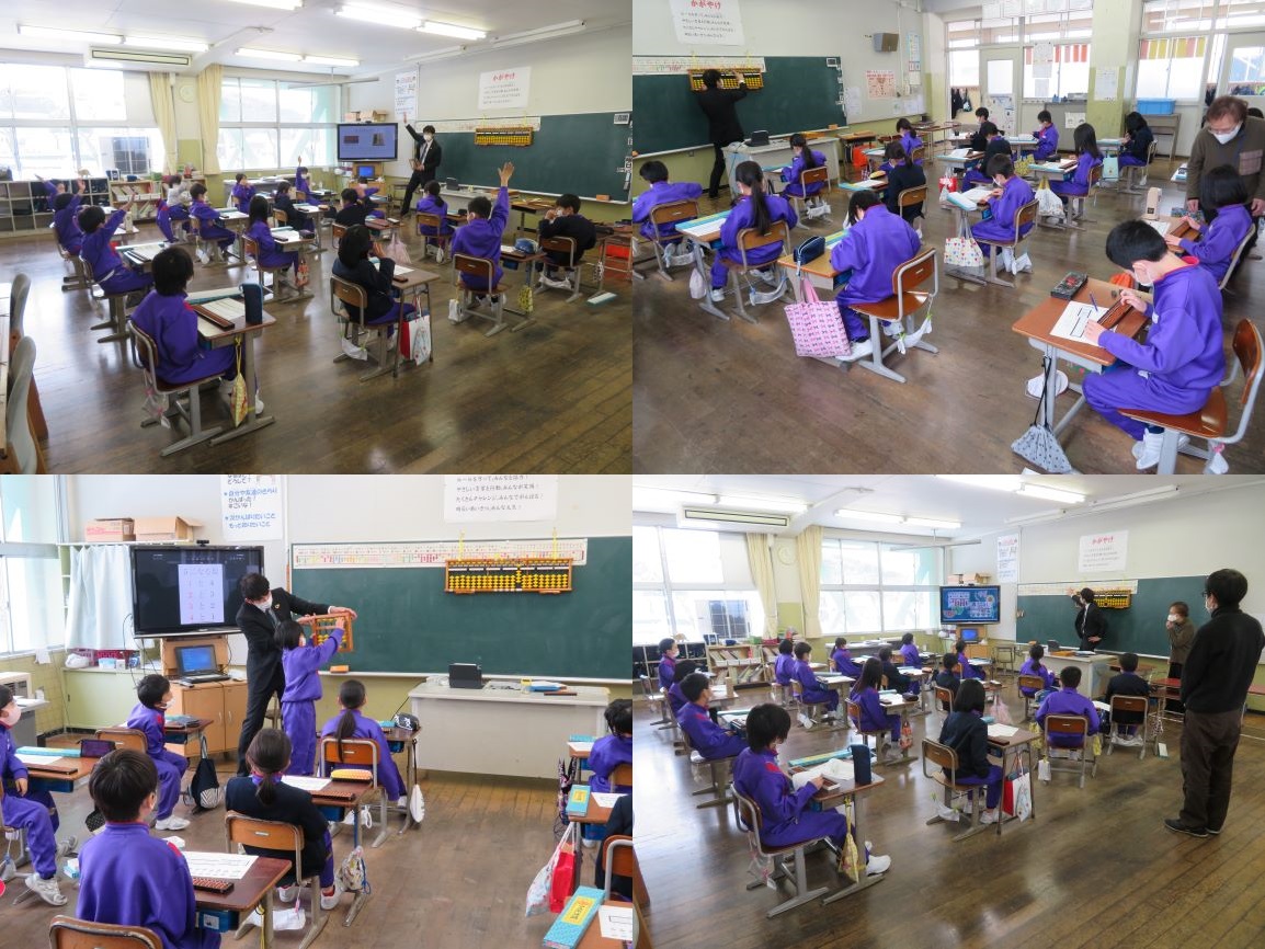 昨年に続いて今年も、講師の先生をお招きして「そろばん教室」を行いました。各部分の名称や指の使い方等を復習した後、そろばんと筆算の違いを考えました。 ①計算の途中が見えること。 ②上の位から計算していくこと。 次に、たし算やひき算をするときに、「10になる数」をもとに計算していくことを教えていただきました。続いて、「日本で一番古いそろばん」についてのクイズを交えながら、いろいろな計算をしました。 最後は、みんなで「人間そろばん」をして、「一十百千万の歌」を歌いました。短い時間でしたが、そろばんの基本的な使い方がよくわかりました。講師の先生方、ありがとうございました。 |