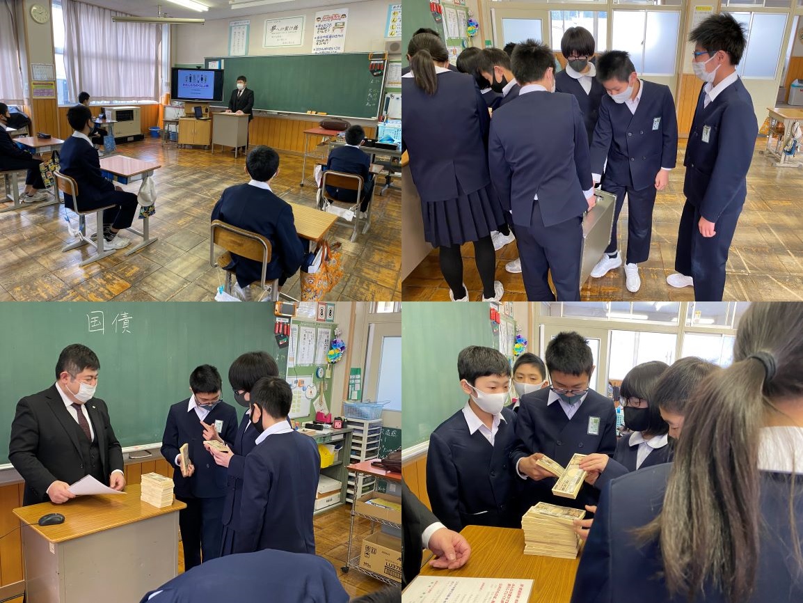 今日の5限目に、敦賀法人会の方々をお招きして、「税金教室」を行いました。 私たちは、どんな税金を払っているでしょう?そして、その税は、どんなふうに使われているんだろう?わりと身近なところで、自分たちが住みやすくするために使われていることがわかったね。1人1人に支給された給付金も税金から支払われていたんだね。 |