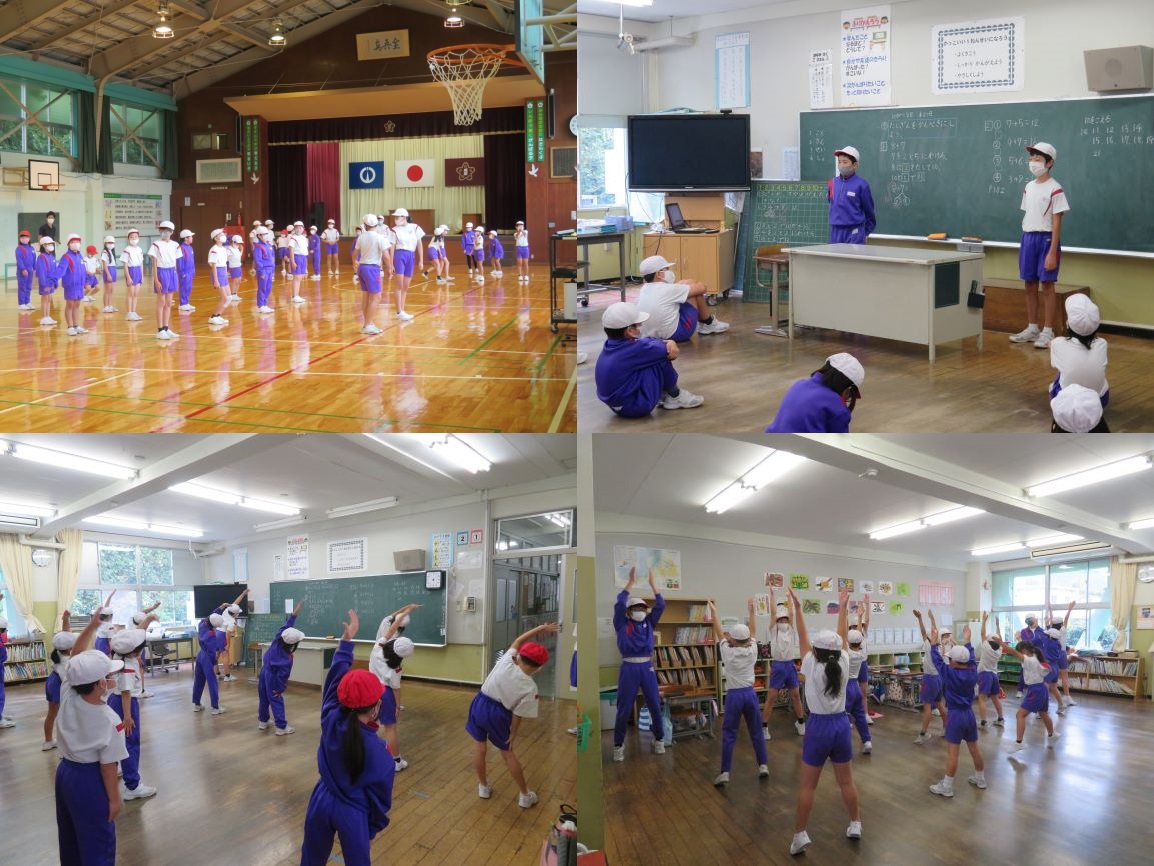| 概要 | 全校児童が、縦割りで5つのチームに分かれて、「ラジオ体操」(今日は①~⑥の運動)の練習をしました。6年生が「ラジオ体操サポーター」として、1~5年生をりーどして、どのチームもぐんぐん上手になっていきます。 |