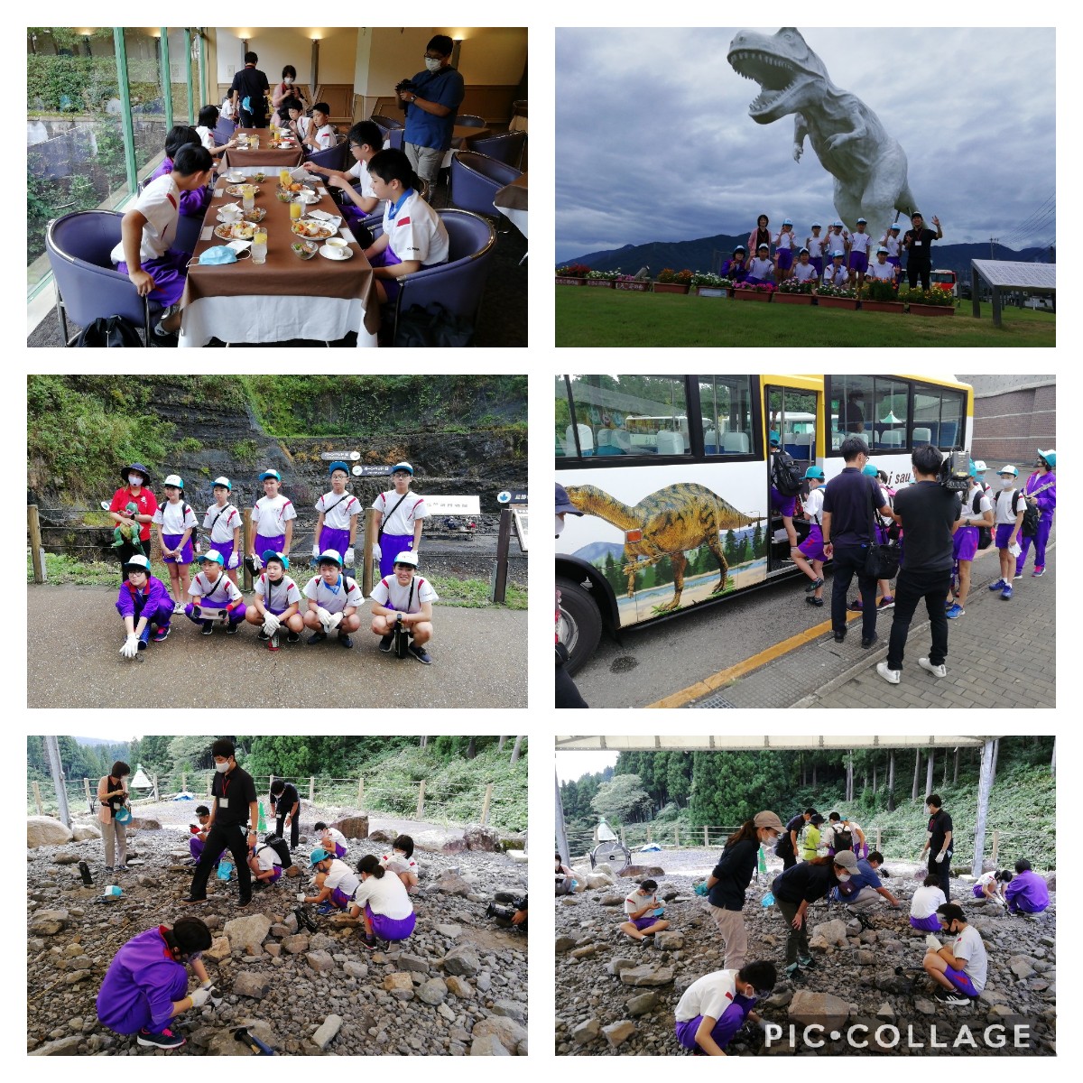 2つ目の見学地は、恐竜博物館です。その前に、「勝山ニューホテル」で昼食をとりました。ジェラカレーセットです。とっても美味しかったです。 雨天バージョンで進んだために、恐竜博物館の館内も見学することができました。 その後、化石発掘体験にチャレンジしました。みんな、必死に発掘していました。 |