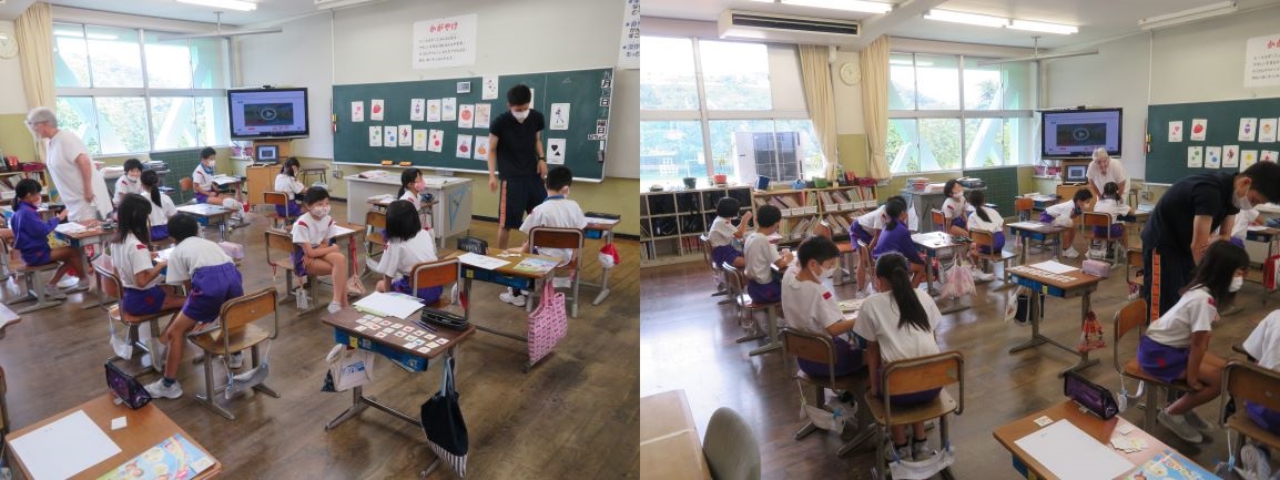 いろいろなスポーツ、食べ物、色などのカードを使って、ペアになって、英語で「それが好きかどうか」を尋ねたり、応えたりしています。