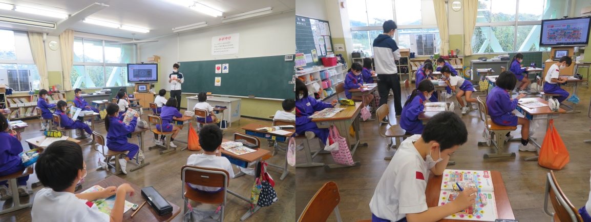 身近なところにあるローマ字表記を探した後、教科書のローマ字表を見て、配列や表記の仕方を学習しています。そして、実際にローマ字を書いてみました。なかなか難しそうです。
