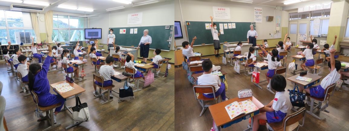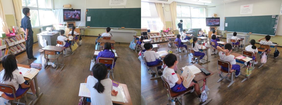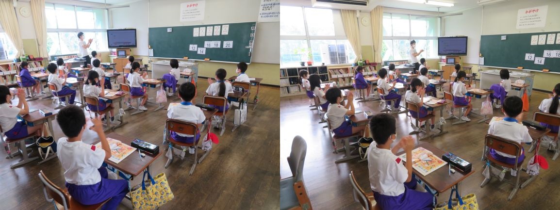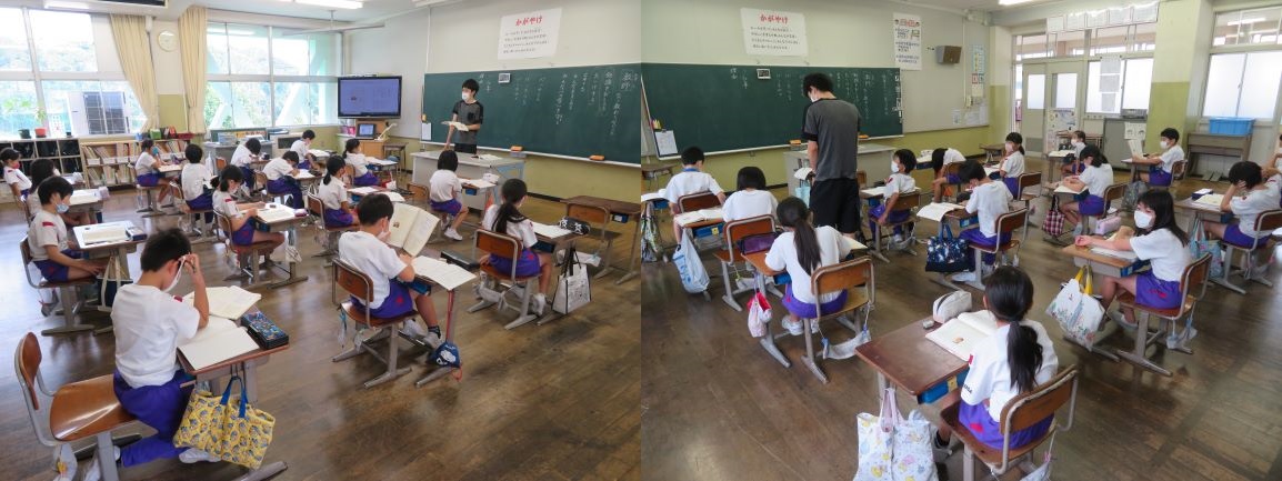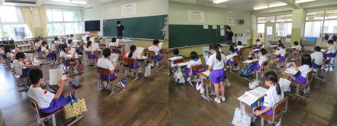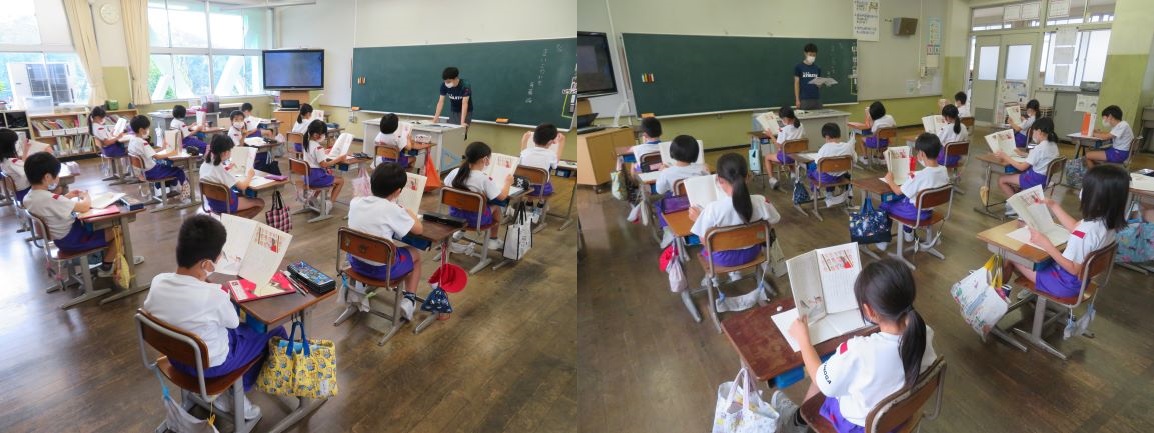 金子みすずさん作の「わたしと小鳥とすずと」と、原田寛夫さん作の「夕日がせなかをおしてくる」を、みんなで音読しています。
