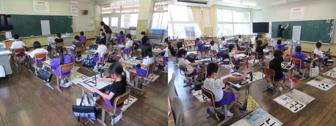 毛筆で書くときの正しい姿勢や筆の持ち方、腕の使い方に注意して、筆を動かす練習をしています。そして、いよいよ、初めて筆に墨をつけます。
