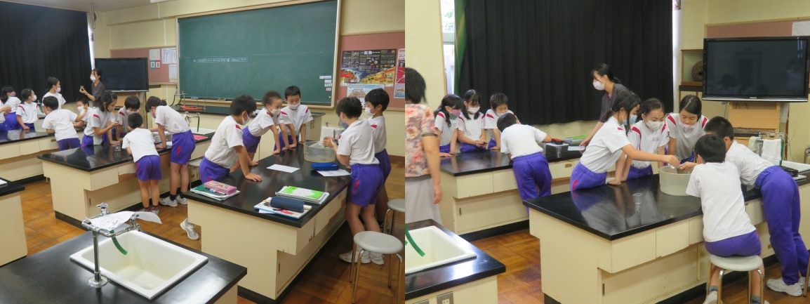 「雨水のゆくえと地面のようす」 土や砂のつぶの大きさによって、しみこみ方に違いがあるのか、砂場の砂と校庭の土で比較して調べる実験をしています。 |