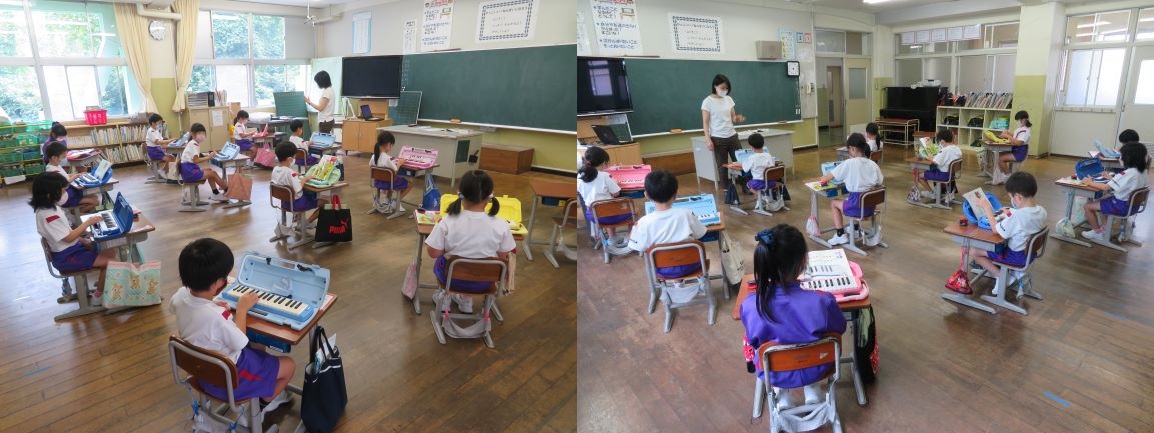 「3 はくにのってリズム」 「どれみであいさつ」などの曲にあわせて歌いながら、鍵盤ハーモニカの「けんばん」を正しく押さえる練習をしています。 |