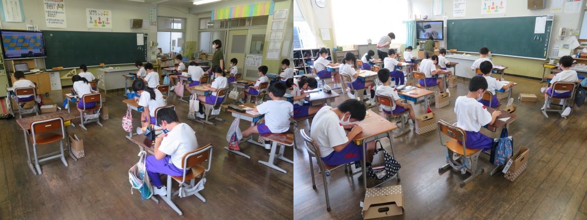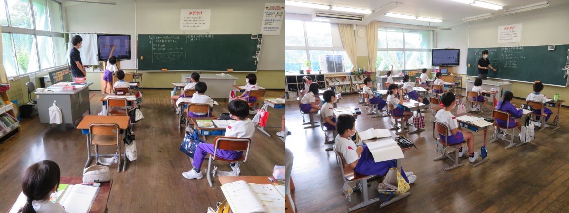 「5 ふえたり へったり」 単元のまとめとして、「算数web単元問題」にチャレンジしています。みんなで答え合わせをして、復習をしました。 |