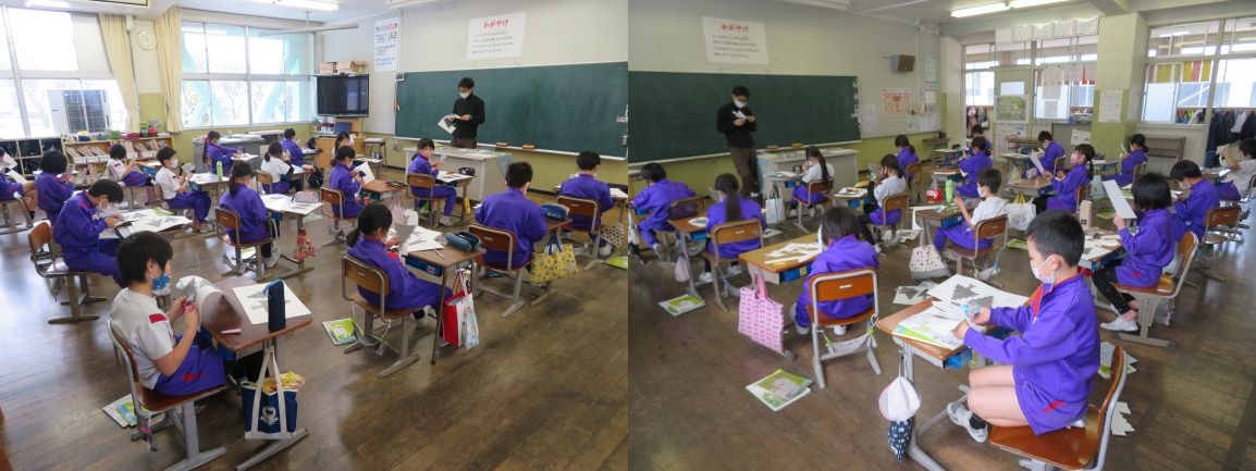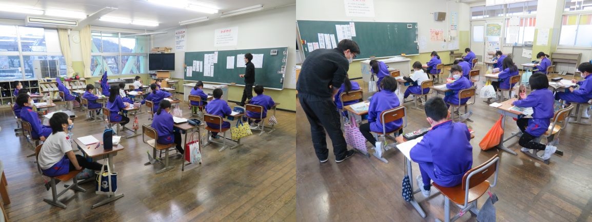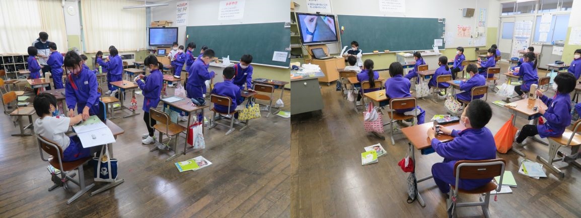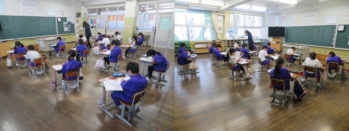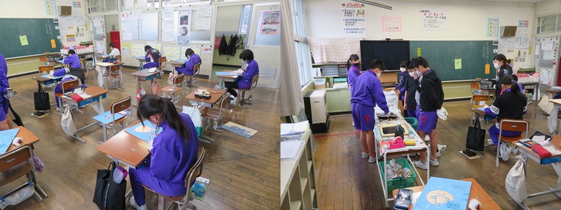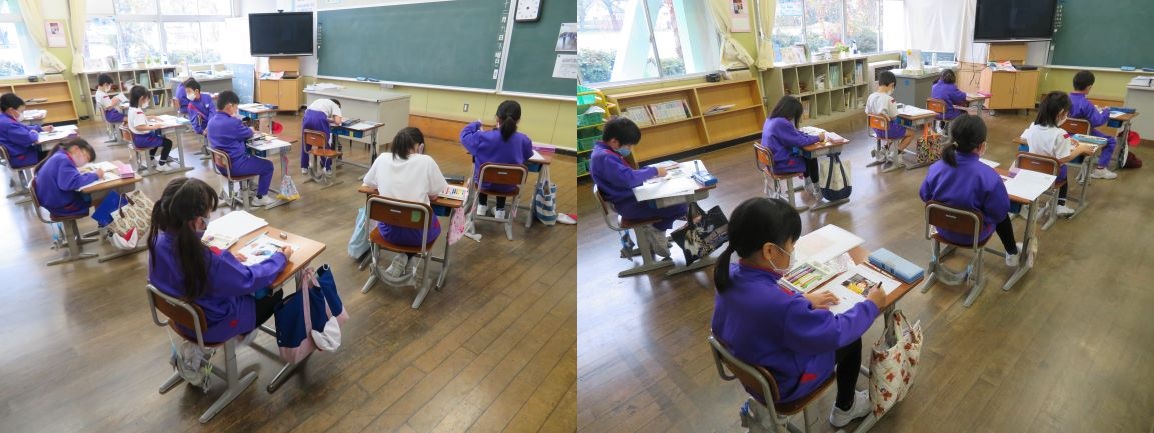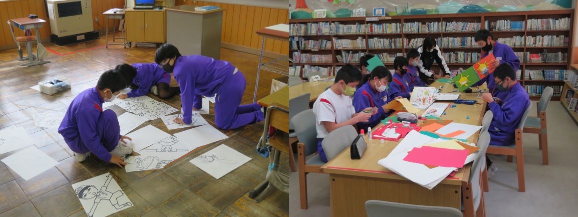 | 概要 | 今日は、2つのグループに分かれて活動しています。1つは、共同版画の下絵づくりをしています。3人で話し合いながら、構想を練っています。もう1つは、閉校に向けての児童玄関の飾りを作っています。みんなで役割分担をして、黙々と作っています。 |