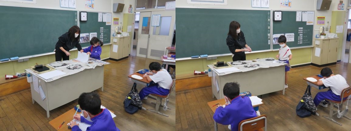 「たのしく うつして」 今日は、版画のためし刷りをしています。漢字のプリントをしながら自分の順番を待っています。インクをつけて、紙をのせたら、バレンでよくこすります。さあ、どんなふうにできたかな? |