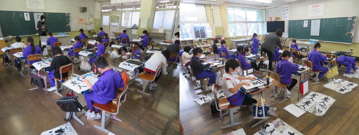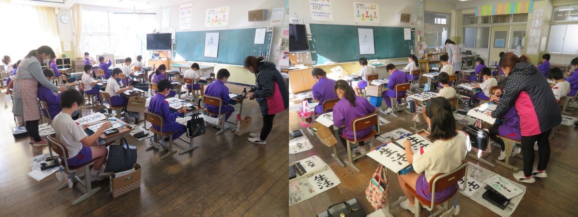 | 概要 | 今日は、専門の講師の先生をお招きして、指導をしていただきました。「温かい心」という字を練習しています。みんな、黙々と取り組んでいます。 |