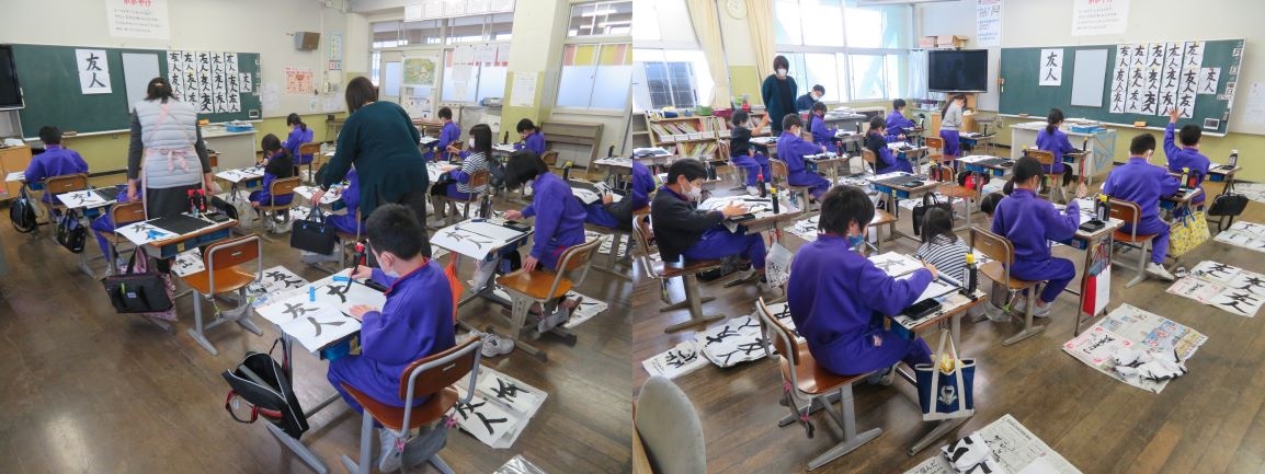 | 概要 | 書き初め作品「友人」を書いています。字のバランスや左右の「はらい」に気をつけて練習しています。 |