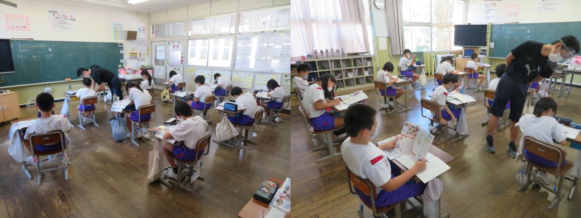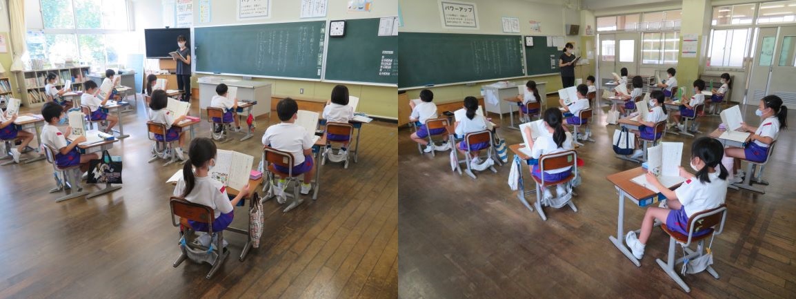 「詩を味わおう」 金子みすずさん作の「わたしと小鳥とすずと」と、原田寛夫さん作の「夕日がせなかをおしてくる」を、みんなで音読しています。 |