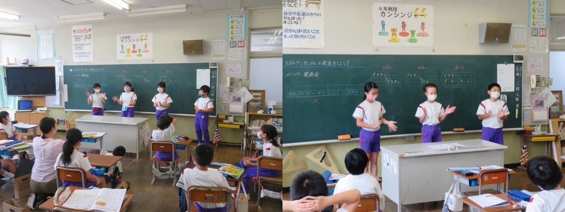 「言葉でリズムアンサンブル」 グループごとに、3つのリズムを組み合わせて、リズムアンサンブルを作って発表会をしています。少し緊張気味ですが、どのグループもすばらしい発表でした。 |