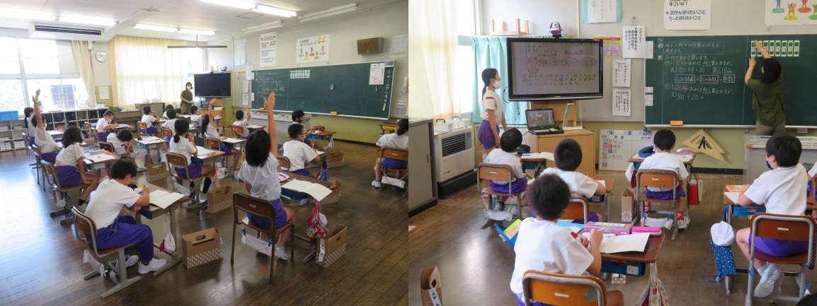 「8 たし算とひき算のひっ算(2)」 一の位と十の位にくり上がりのある筆算のしかたについて、みんなで考えています。計算をした後は、数え棒を使って、みんなでたしかめをしています。 |