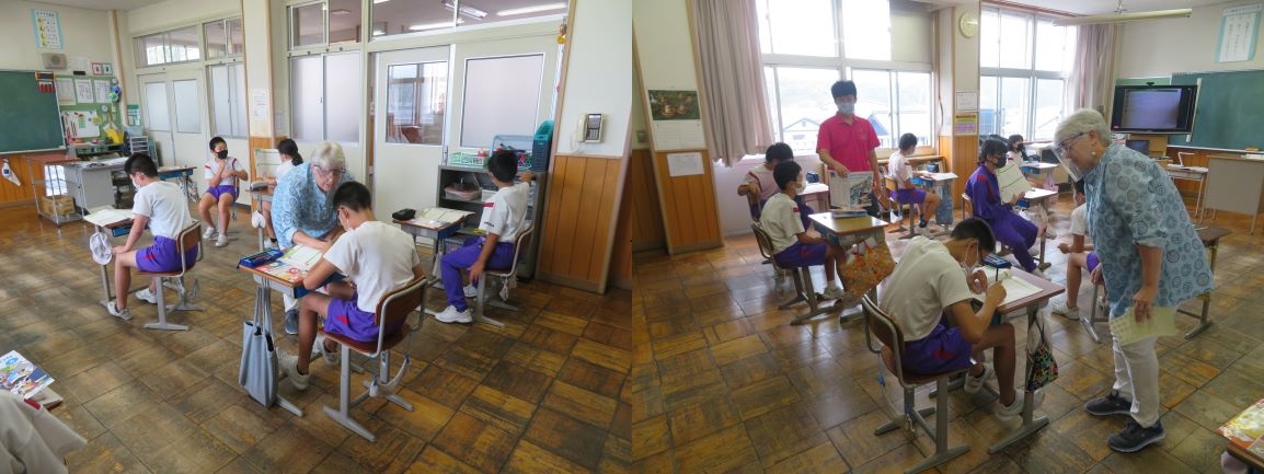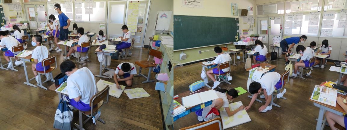 「心に残った あの時、あの場所」 夏休みの思い出を、1枚の絵にしています。できあがった人から、次の「立ち上がれワイヤーアート」を始めています。 |