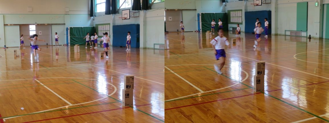| 概要 | ハードル走の前段階として、いろいろな間隔、いろいろな高さの物を、跳びながら走る練習をしています。なかなか難しそうです。 |