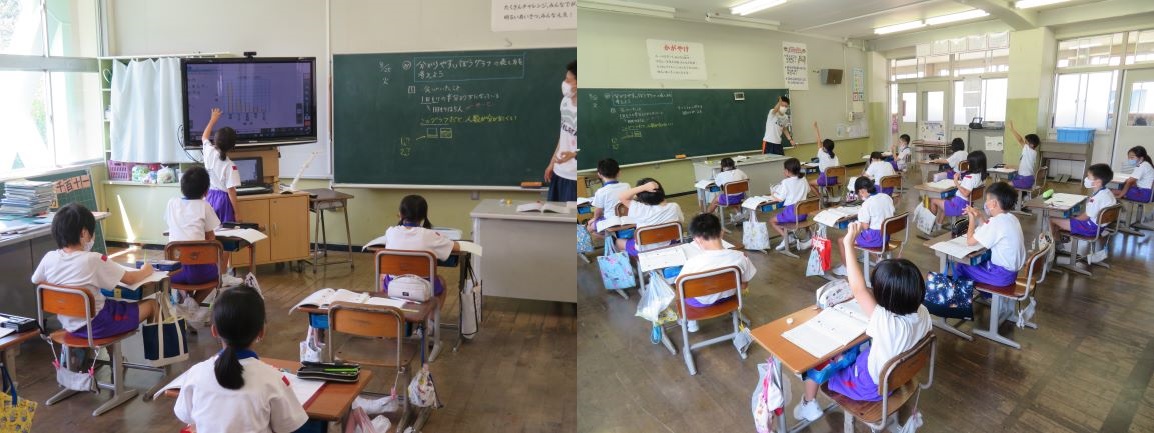 「6 表とグラフ」 「6月のけが調べ」の結果を表した、2つの棒グラフを比べて、気づいたことを発表し合っています。だんだんと分かってきたことは・・・ |