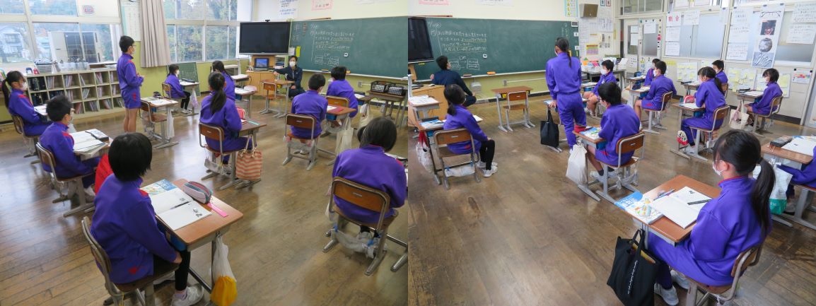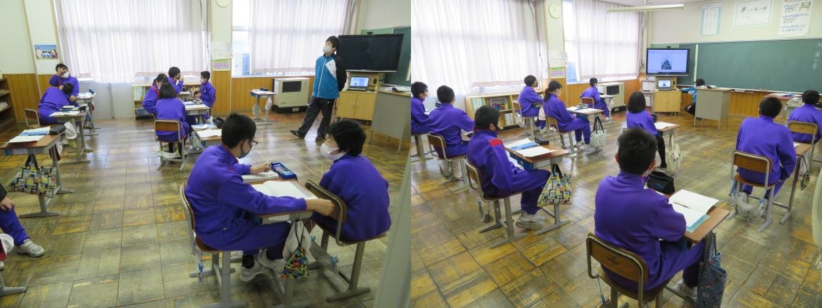今日は3限目に、角鹿中学校2年生による「新1年生サポートプロジェクト」が、遠隔システムを活用して行われました。 内容は、①角鹿中クイズ、②部活動紹介、③お悩み相談でした。どの企画も、よく工夫されたもので、6年生の皆は、クイズにリアクションしたり、中学校生活への不安に応えてもらったりして有意義な時間を過ごすことができました。角鹿中2年生の皆さん、ありがとうございました。 |