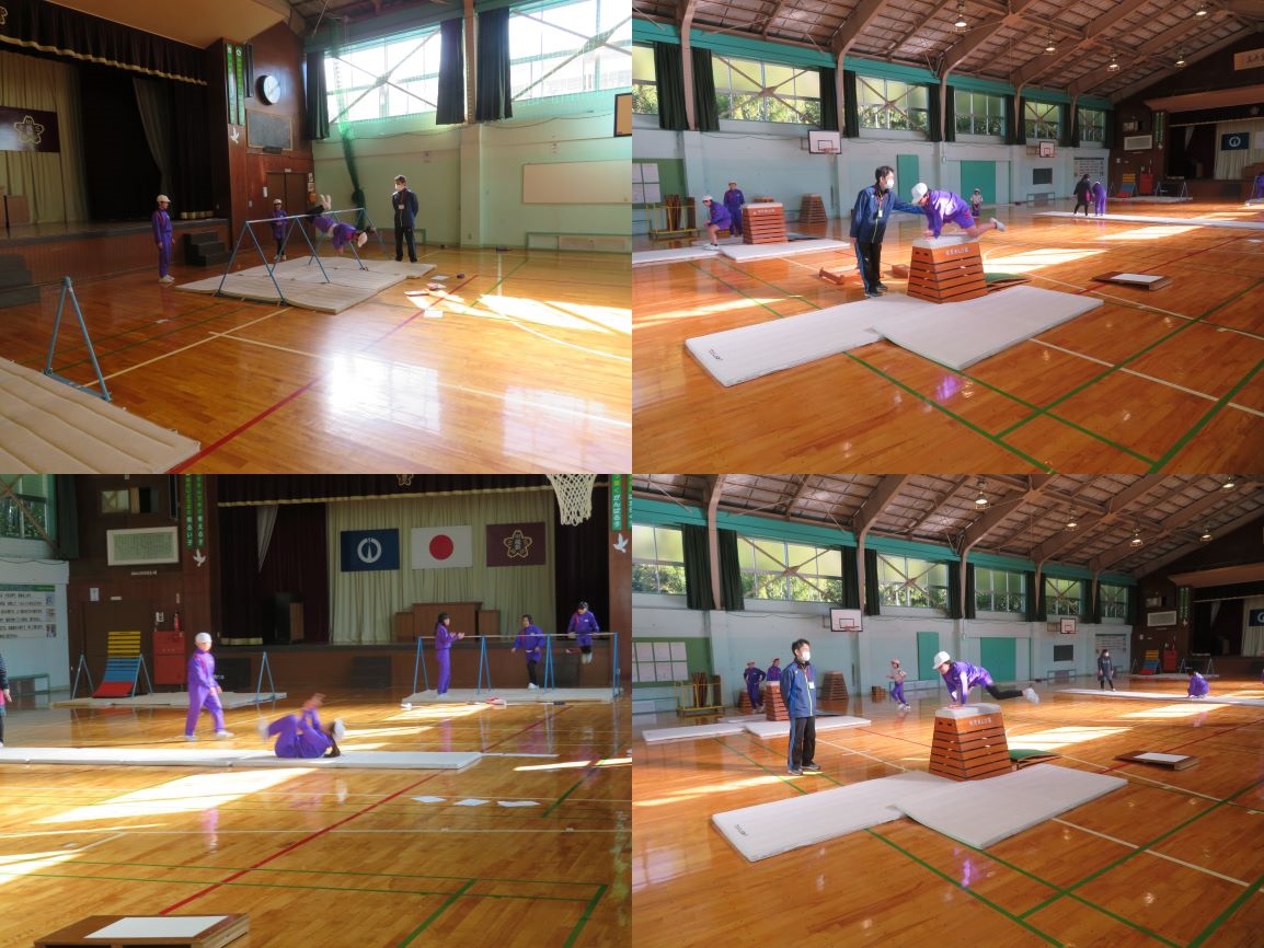 | 概要 | マット運動、跳び箱運動に分かれて、自分の技を練習しています。着地やフィニッシュなどにも気をつけて、取り組んでいます。1週間後の「器械運動発表会」が楽しみです。 |