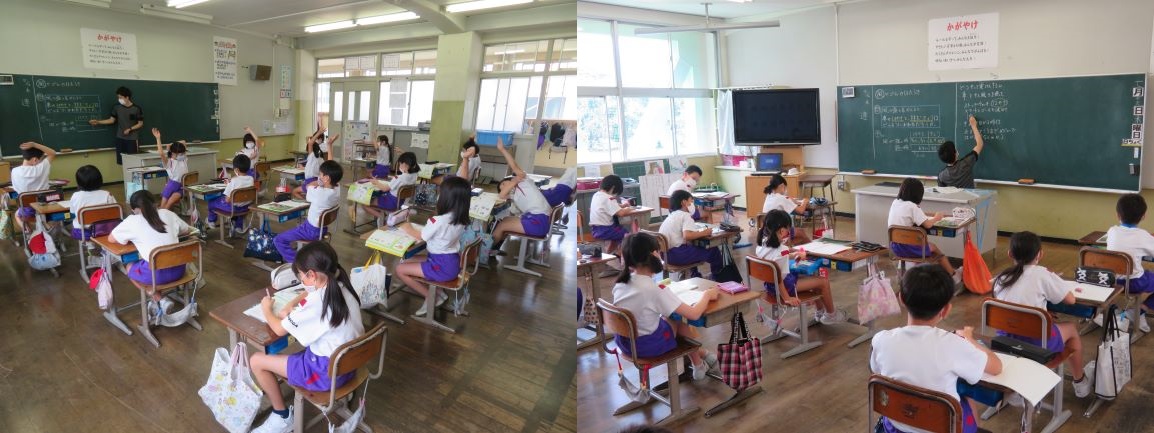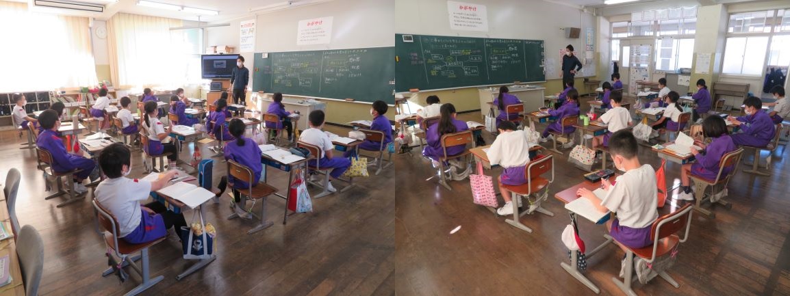 前回の授業で、紙を切って作った二等辺三角形と正三角形のかどの形がどうなっているかを、みんなで考えています。