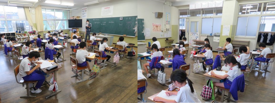三年生のまとめとして「水玉」という字を書いています。これまで学習してきたことに気をつけて、一生懸命練習しています。