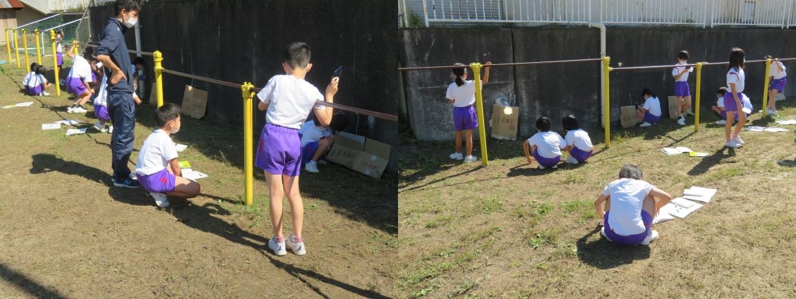 太陽の向きと影の向きを観察して、太陽の向きと影の関係について調べています。