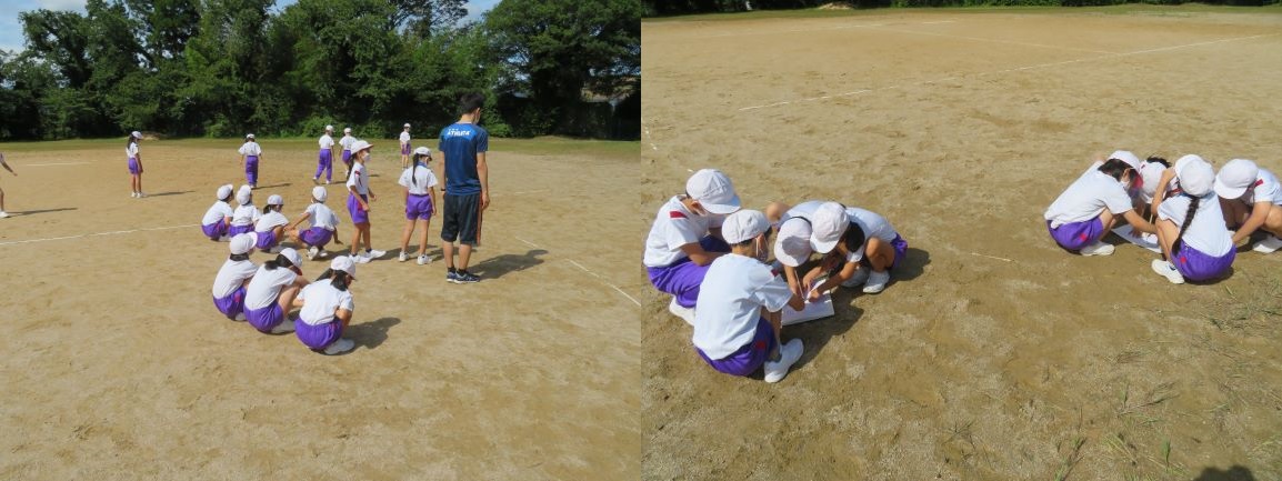 ボールをいろいろな角度から見て、気づいたことを、各グループで話し合って、ノートにまとめています。