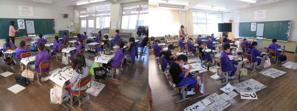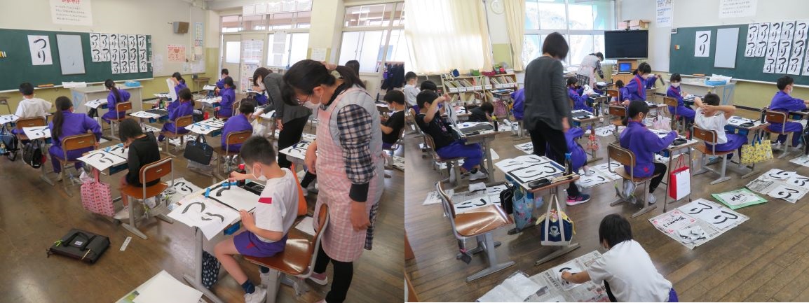 「つり」という、ひらがな2文字を一度書いてみて、筆の力のいれぐあいを、みんなで振り返ってから2枚目に挑戦です。