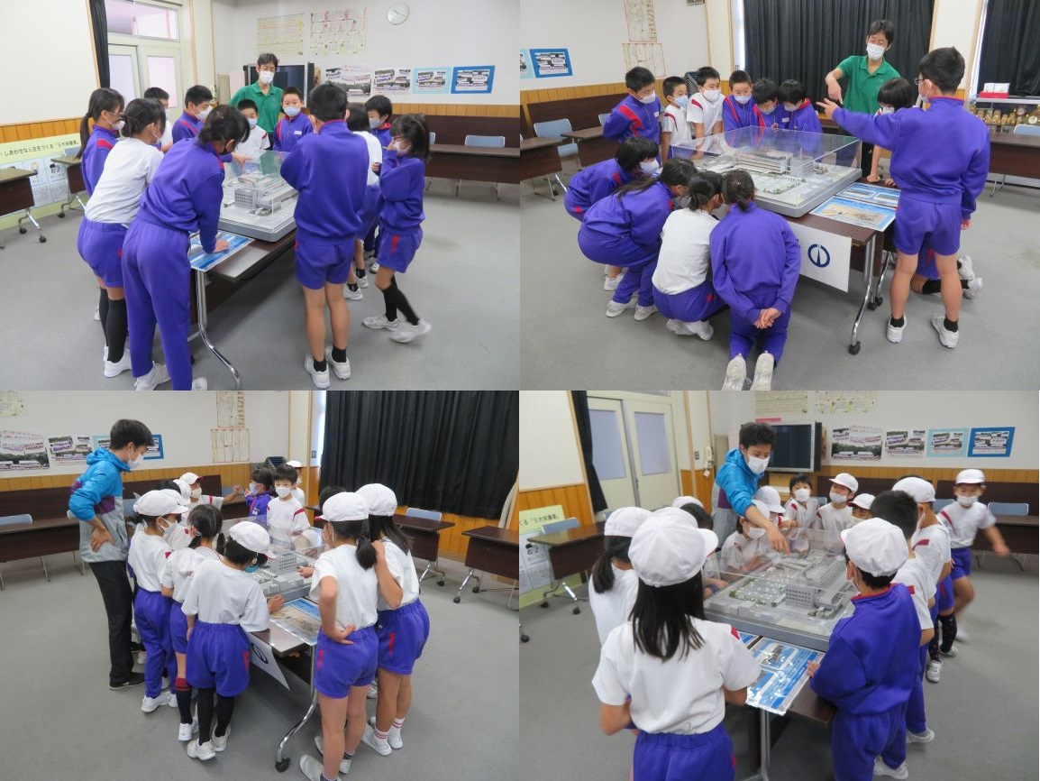 | 概要 | 今週から貸し出していただいている「市庁舎の模型」を児童が見学しています。今日は、3年生と5年生が、業間や昼休みの時間を利用して見学しました。「すごい」「中の方までつくってある」など、とっても興味深げに、細かな点まで観察していました。 |