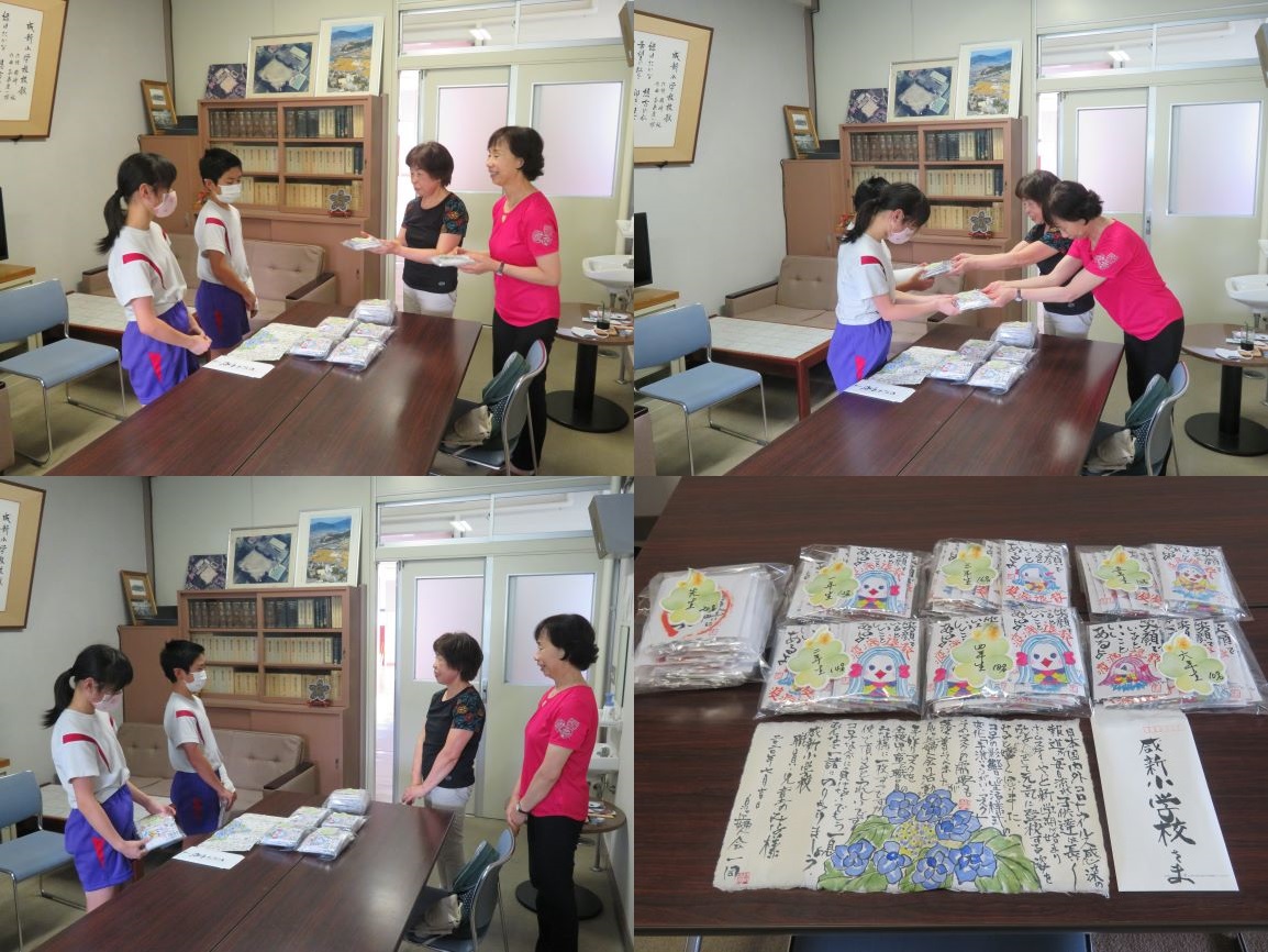 | 概要 | 今日、泉ヶ丘婦人会の方々がご来校され、咸新小学校の全校児童と先生方にと、手作りマスクをご寄贈いただきました。一つ一つを手作りされ、きれいにラッピングしていただき、すてきなメッセージをそえていただきました。5,6年生の児童代表2名が、みんなを代表してお礼の言葉を伝えました。明日、全校児童に配付させていただきます。本当に、ありがとうございました。大切に使わせていただきます。 |