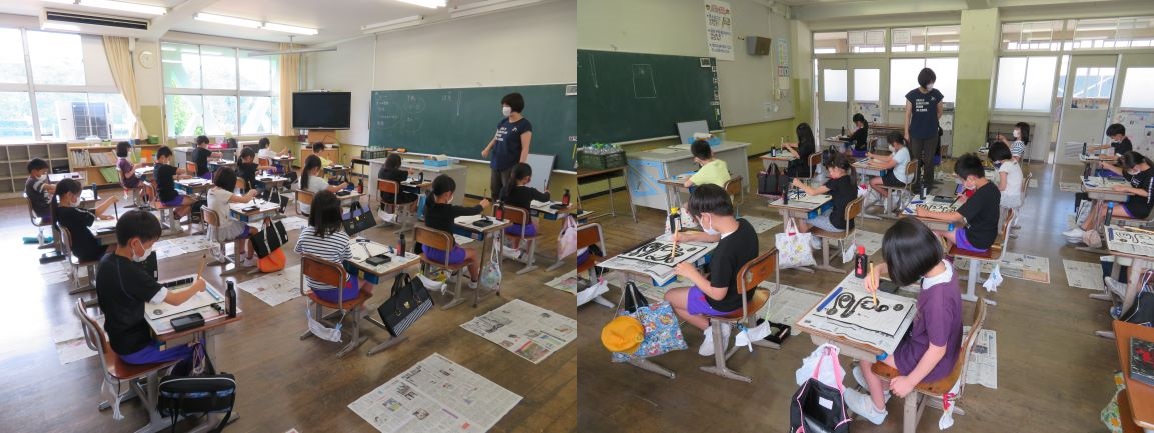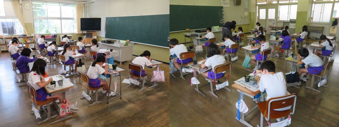 「書くときの姿勢、筆の持ち方」 毛筆で書くときの正しい姿勢や筆の持ち方、腕の使い方に注意して、筆を動かす練習をしています。そして、いよいよ、初めて筆に墨をつけます。 |