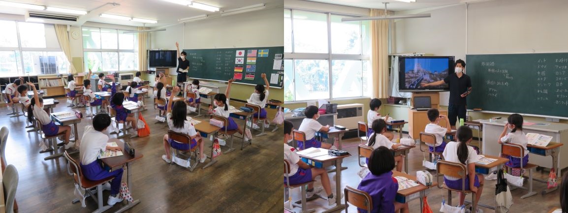 「Hello!」 世界には、とても多くの国があり、いろいろな建物や景色があることを、映像を見ながら学習しています。 |