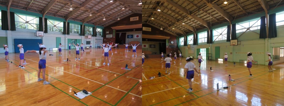 | 概要 | 体育館いっぱいに間隔をとって、マスクをとって、その場でできる運動を行っています。まずは、ラジオ体操で準備運動をした後、持久跳びに挑戦しています。 |